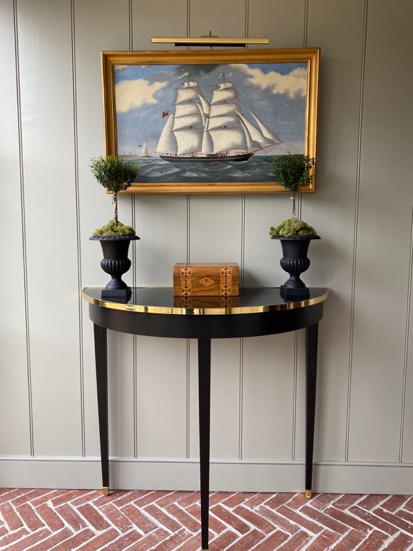 We’re dressing up the classics. A perfect demi lune in our signature lacquer finish and brass trim to add shine and dimension. Dressed up or dressed down, this is our new favorite piece!