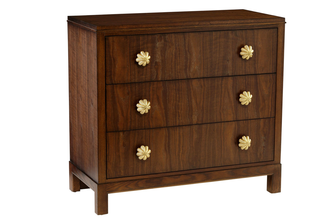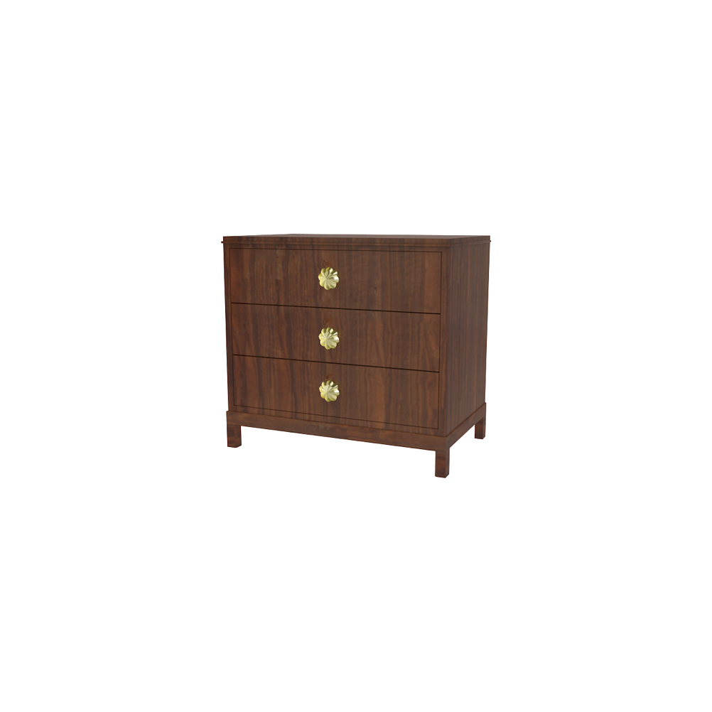 Cerused Walnut finish with our exclusively designed “shell” hardware. The nightstand size has three drawer pulls, available in either brass or nickel.