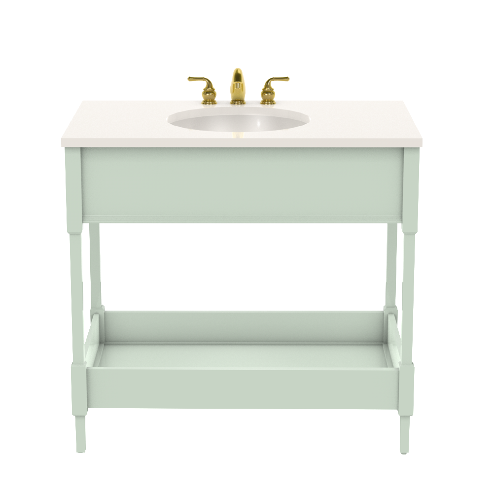 The Kensington Vanity makes a bold statement with its simplicity and architectural detailing. Don’t shy away from color here, it’s happiest in something bold! Bottom shelf.